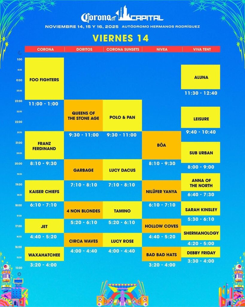 Como cada edición, los fans de la música se van a tener que romper la cabeza para decidir qué artistas disfrutar, sin duda las opciones son bastantes y nunca faltará el empalme de grupos que deseas disfrutar, vayan hidratándose con días de antelación y también preparan el físico, los horarios de inicio del evento por día será poco después de las 3pm y finalizará a la 1am del día siguiente, aquí abajo te dejamos los horarios por día.