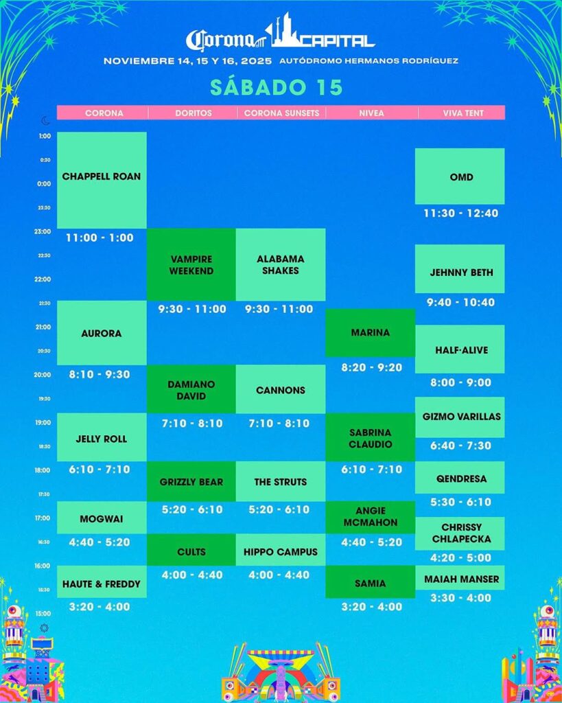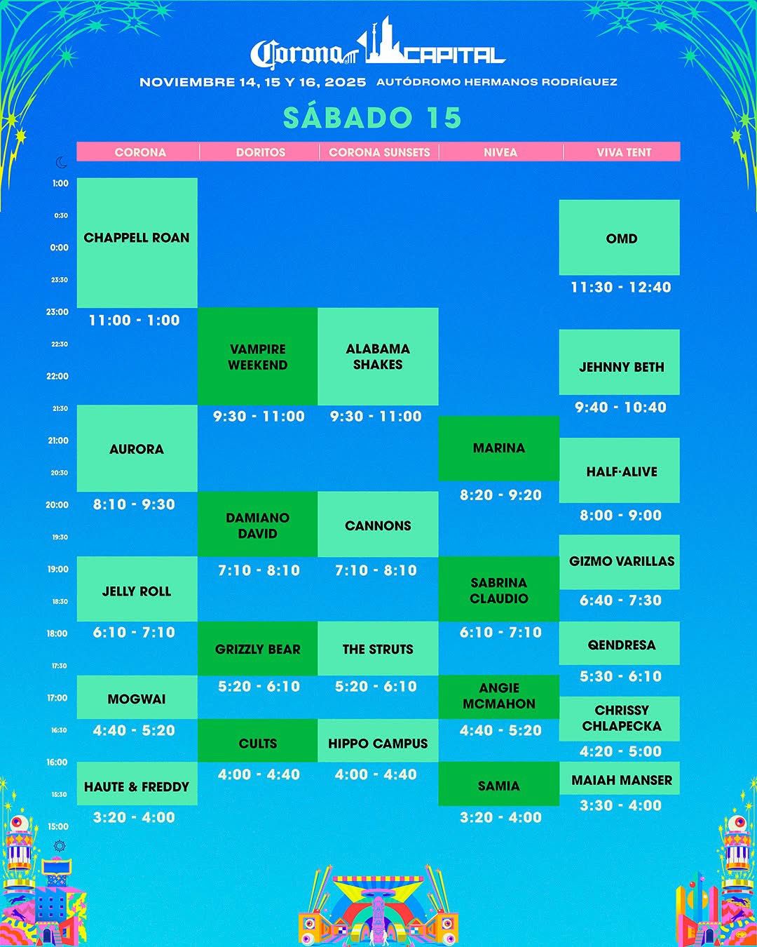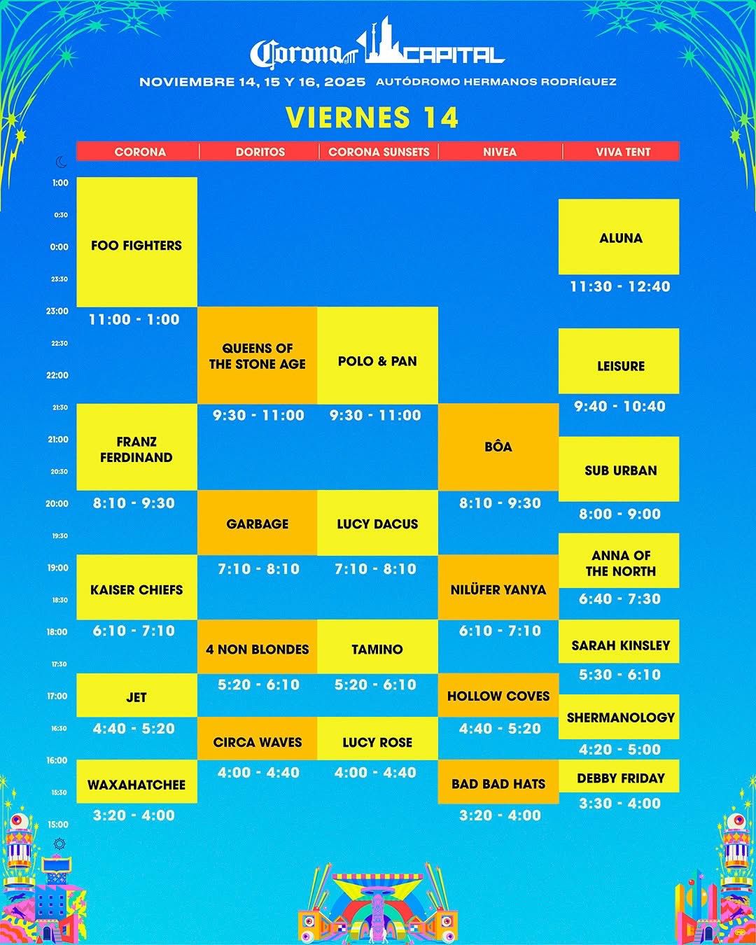 Como cada edición, los fans de la música se van a tener que romper la cabeza para decidir qué artistas disfrutar, sin duda las opciones son bastantes y nunca faltará el empalme de grupos que deseas disfrutar, vayan hidratándose con días de antelación y también preparan el físico, los horarios de inicio del evento por día será poco después de las 3pm y finalizará a la 1am del día siguiente, aquí abajo te dejamos los horarios por día.
