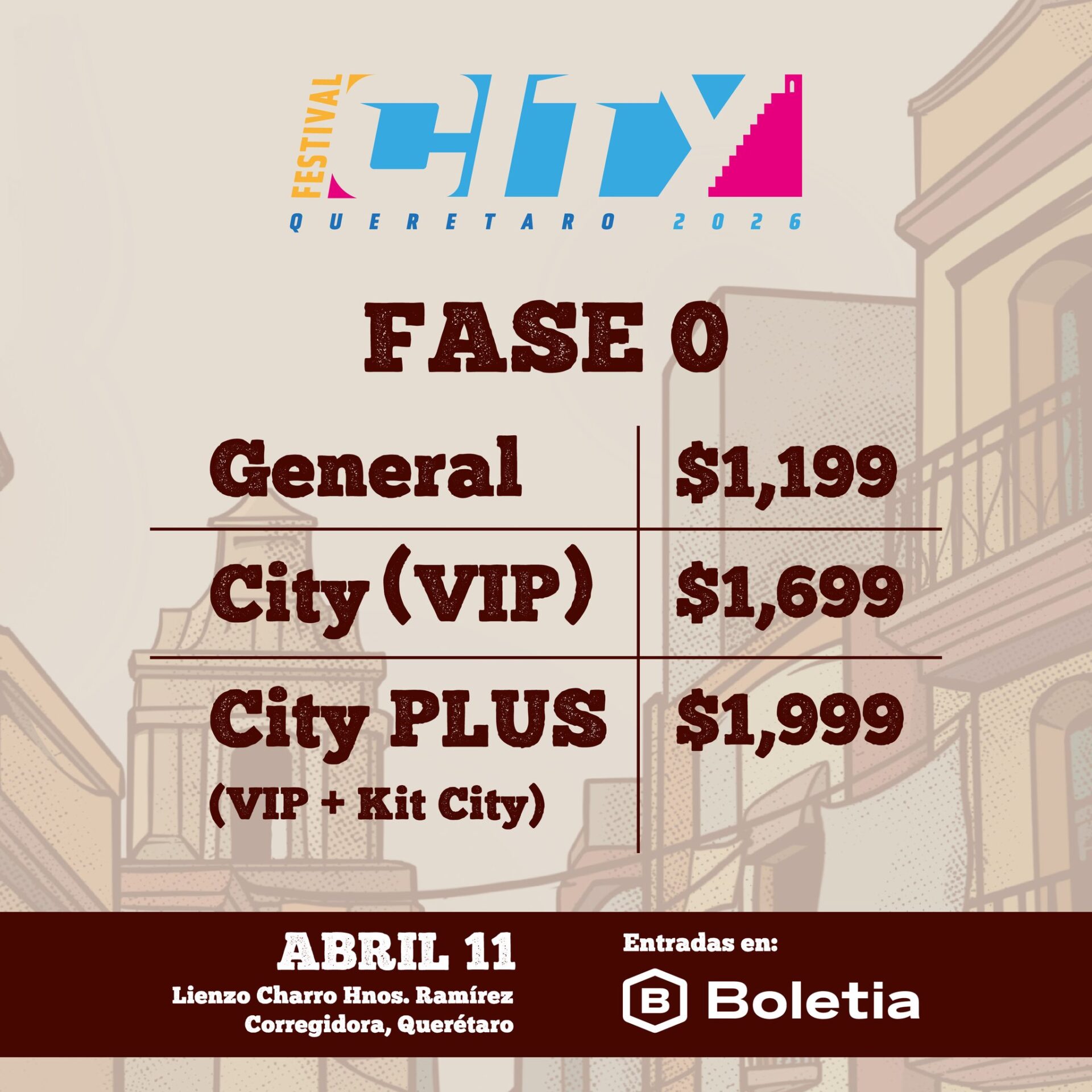 En esta Fase 0, los boletos generales estarán en 1199 pesos, los CITY (VIP) tendrán un costo de 1699 pesos, mientras que el CITY Plus estará en 1999 pesos; los boletos estarán disponibles a partir del miércoles 5 de noviembre a las 11am en la boletera de Boletia.