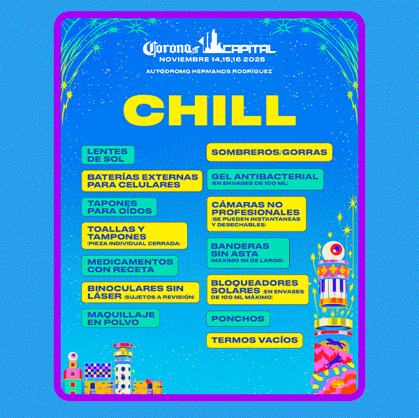 Todo está listo para vivir una de las ediciones más importantes del festival Corona Capital (que cumple quince años), es por ello que para que no se te olvide nada te hacemos esta guía básica para que tengas todo en orden previo a tu asistencia, el festival se realizará el 14, 15 y 16 de noviembre en el Autódromo Hermanos Rodríguez, si aún no cuentas con accesos puedes encontrar los últimos a través de Ticketmaster.