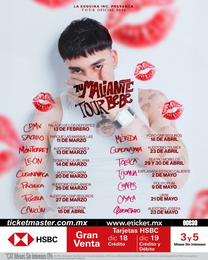 Esta es tu oportunidad de vivir la experiencia completa de TU MALIANTE BEBE TOUR, una serie de show irrepetibles para que disfrutes al poeta del reggaetón mexa. Disfruta de la Gran Venta HSBC los días 18 y 19 de diciembre (para CDMX, MTY y GDL) a través de Ticketmaster; en el caso del resto de las ciudades, encontrarás tus boletos en E-Ticket. La Venta General estará disponible un día después. ¡Sé parte de esta versión de El Malilla con el perreo más romántico!