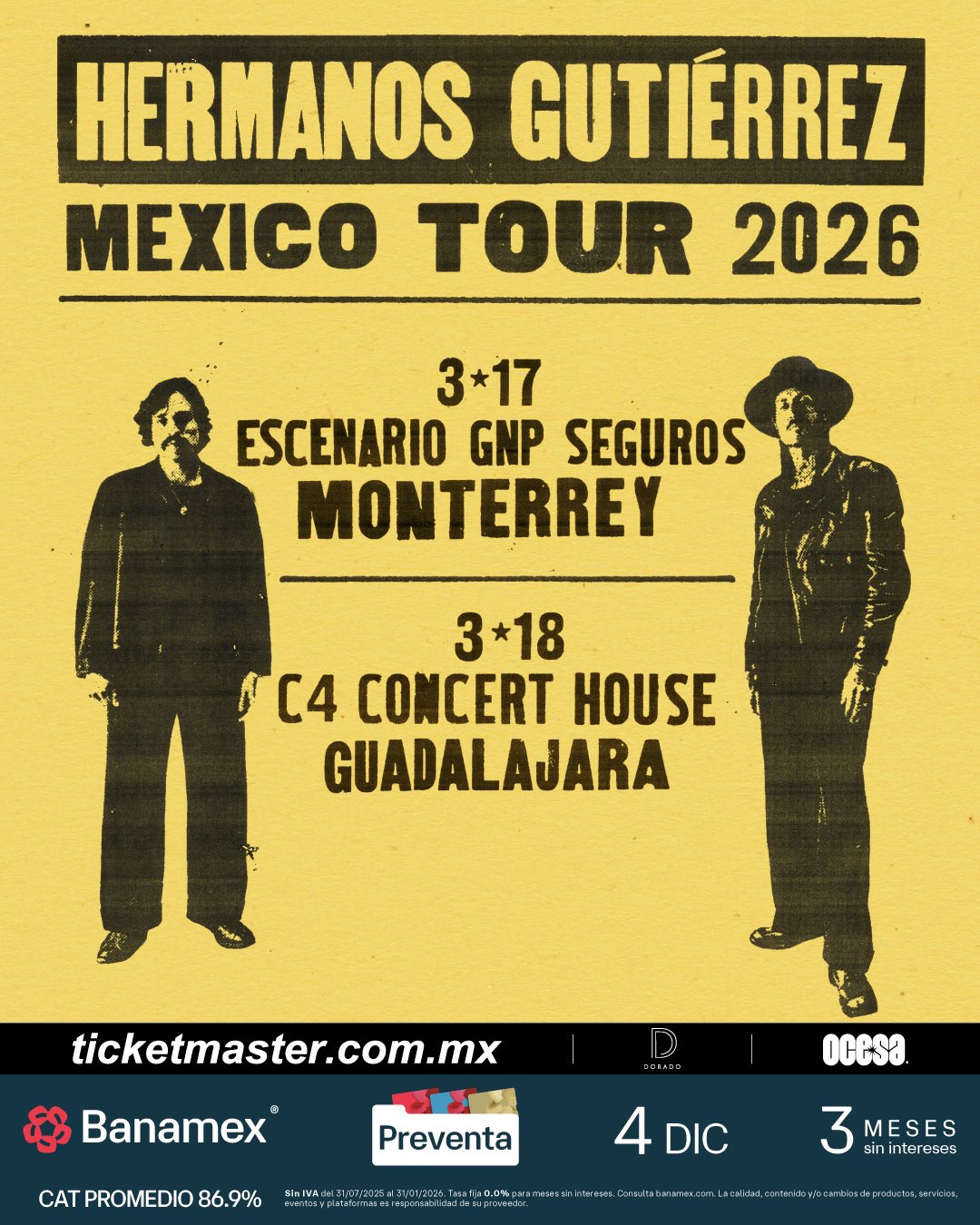 La magia musical de Hermanos Gutiérrez, el dúo integrado por Alejandro y Estevan, llegará a México para cautivar al público con dos presentaciones imperdibles: el 17 de marzo de 2026 en el Escenario GNP Seguros de Monterrey y el 18 de marzo en el C4 Concert House de Gudalajara. Con un sonido que evoca la esencia de la América Latina de los años cincuenta, su música transporta a los oyentes a paisajes sonoros llenos de belleza, nostalgia y una profunda carga emocional.