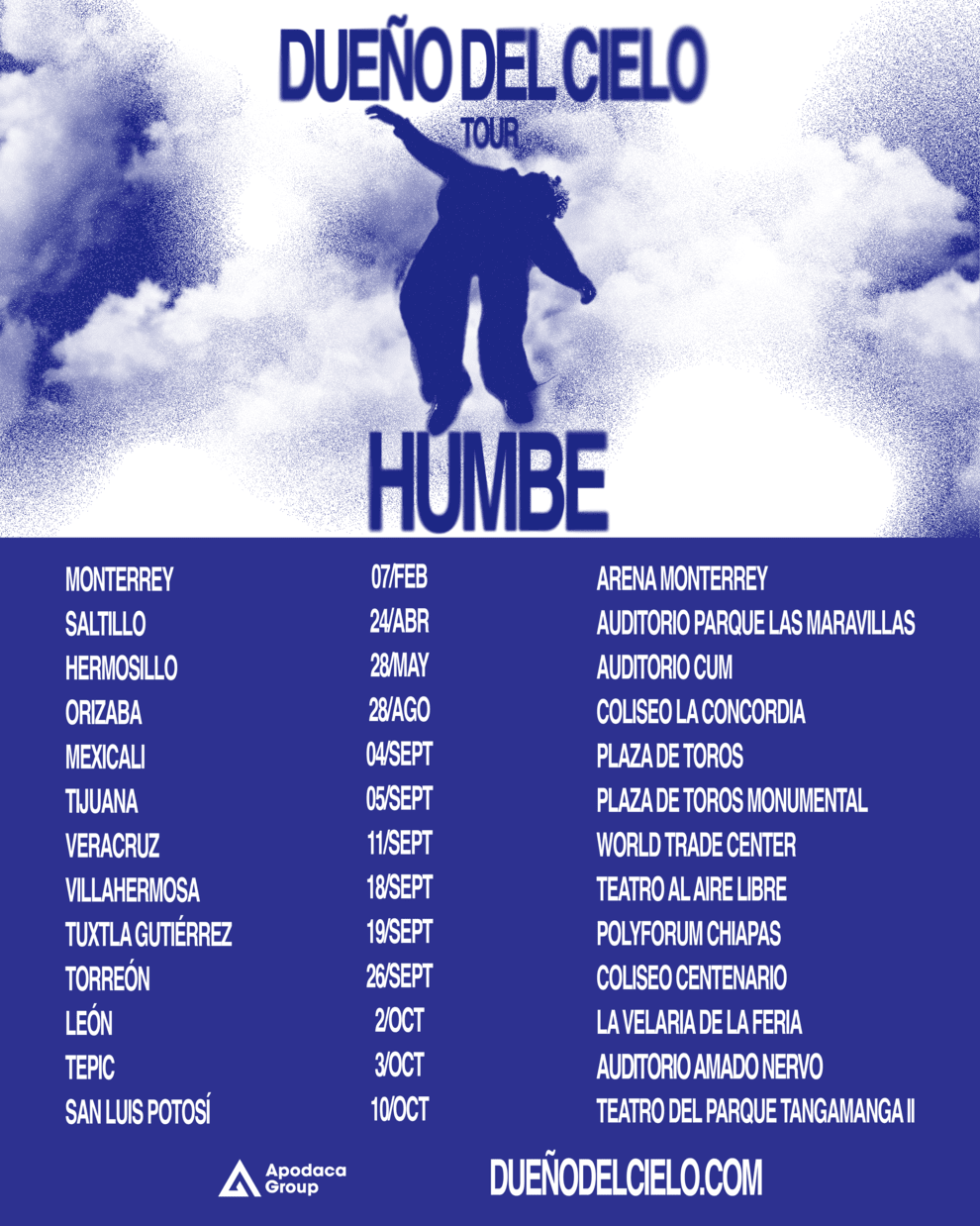 «Dueño del Cielo» Tour será la oportunidad perfecta para que los fans experimenten la evolución artística de Humbe en vivo. Los conciertos están diseñados para ser una experiencia sensorial completa, combinando visuales cautivadores con la pasión y la energía que lo caracterizan en el escenario. Su repertorio recorrerá sus mayores éxitos y presentará lo más nuevo de su colección musical, haciendo de cada noche un evento inolvidable.
