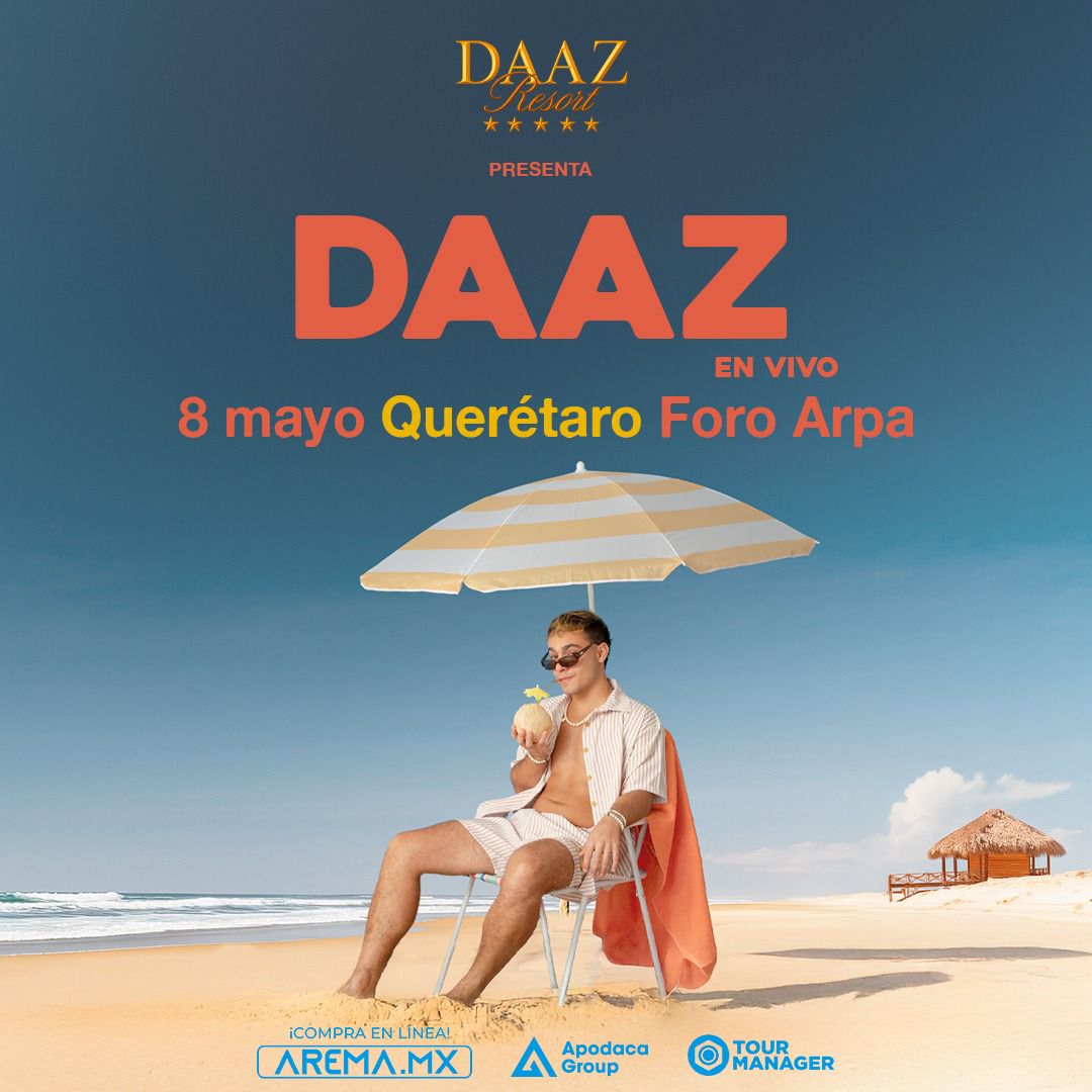 El artista, productor y compositor cancunense, DAAZ, anuncia su regreso al Foro Arpa en Querétaro, el próximo 8 de mayo, su música es una mezcla entre pop con rap, este último, lo rima de una manera única y casual, mientras que sus canciones están cargadas de melodías pop frescas, instrumentales y acordes pegajosos dotados de una vibra caribeña que te transportan automáticamente a la playa.