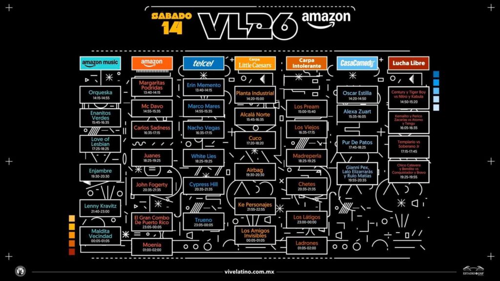 Ve planeando tu caminata en los dos días de duración del festival, el evento iniciará poco antes de las 2pm y finalazará a las 2am del día siguiente, el Vive Latino se celebrará el 14 y 15 de marzo de 2026 en el Estadio GNP Seguros, no olvides que puedes adquirir tus accesos a través de Ticketmaster.
