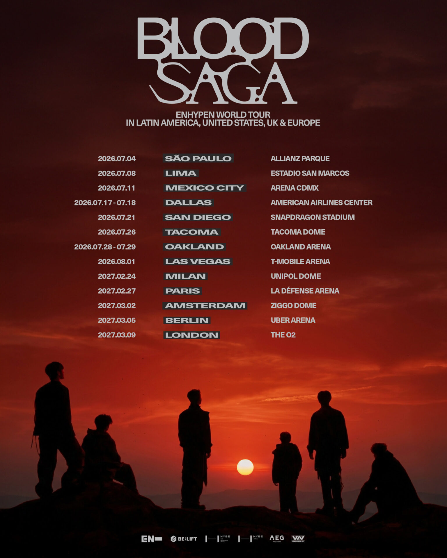 Tras el inicio de la gira en el KSPO Dome de Seúl el 1 de mayo, con tres conciertos consecutivos —todos agotados en preventa—, el poderoso grupo llevará ‘BLOOD SAGA’ a Latinoamérica por primera vez este verano, con paradas en São Paulo, Lima y Ciudad de México. La gira continuará por Estados Unidos, con presentaciones en Dallas, San Diego, Tacoma, Oakland y Las Vegas.