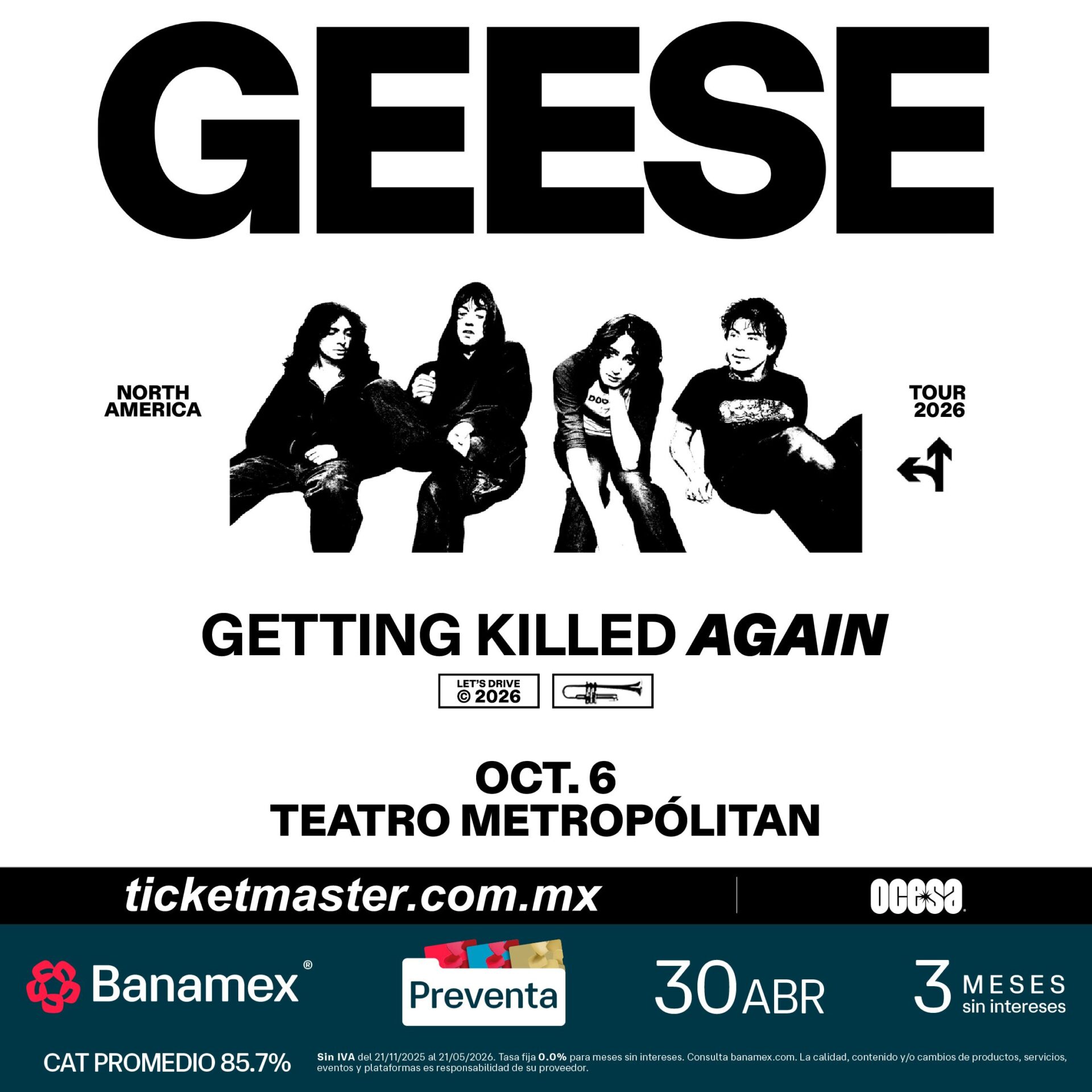 La banda de rock estadounidense, Geese, anuncia su gira por Norteamérica en este 2026, Getting Killed Again. Iniciando el 29 de septiembre en Nashville, esta nueva etapa por el continente los llevará a tocar en recintos aún más grandes durante el otoño, incluyendo el show como headliner más grande de su carrera hasta la fecha: un concierto en casa en el Forest Hills Stadium de Queens el 2 de octubre. Su presentación en Ciudad de México tendrá lugar el próximo 6 de octubre en el emblemático Teatro Metropólitan.